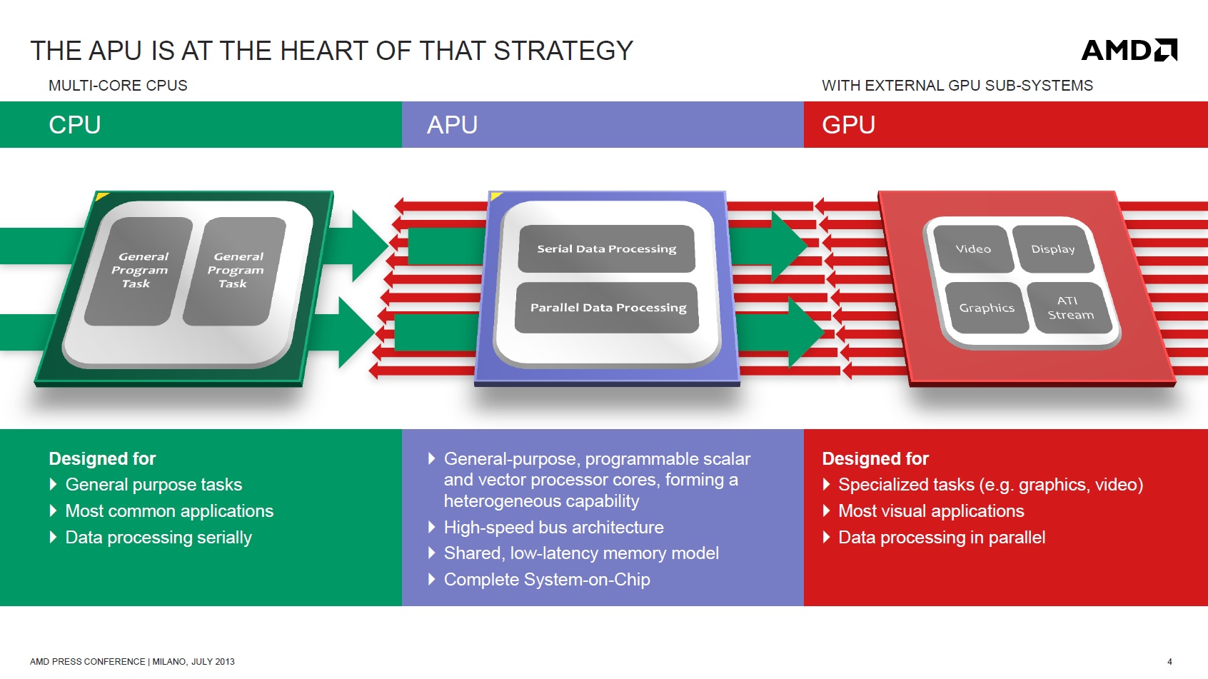 AMD ormai da qualche anno fa delle APU il proprio cavallo da battaglia; l'integrazione di CPU e GPU in uno stesso chip offre molteplici vantaggi, il più evidente consiste nel fatto che un APU è un processore in grado di svolgere in modo piuttosto efficiente la stragrande maggioranza dei calcoli e inoltre la comunicazione tra CPU e GPU è considerevolmente più veloce, e questo non può che favorire un incremento delle performance.
