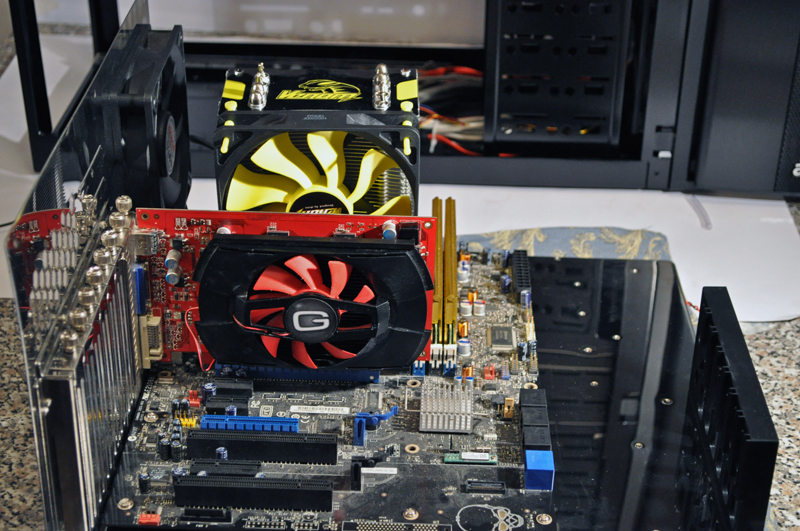 Per prima cosa montiamo la nostra scheda madre sul vassoio, poi la cpu col il dissipatore Akasa Venom, recensito qui e le memorie.