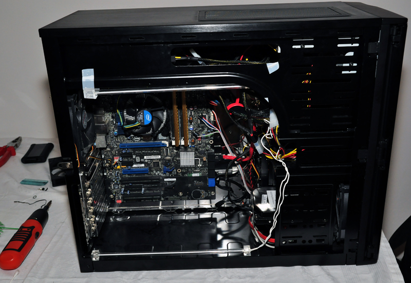 Montiamo il vassoio con i suoi relativi componenti sul case e infine andiamo a montare l’alimentatore nella parte alta. Abbiamo usato un discreto alimentatore non modulare. Come si può vedere dal risultato il tutto è confuso e l’areazione all’interno del case è compromessa da tutto quel groviglio di casi. Sicuramente la situazione può migliorare, ma con un alimentatore modulare la situazione è ben diversa. Purtroppo il case non ci aiuta molto nel nascondere i cavi dell’alimentatore.
