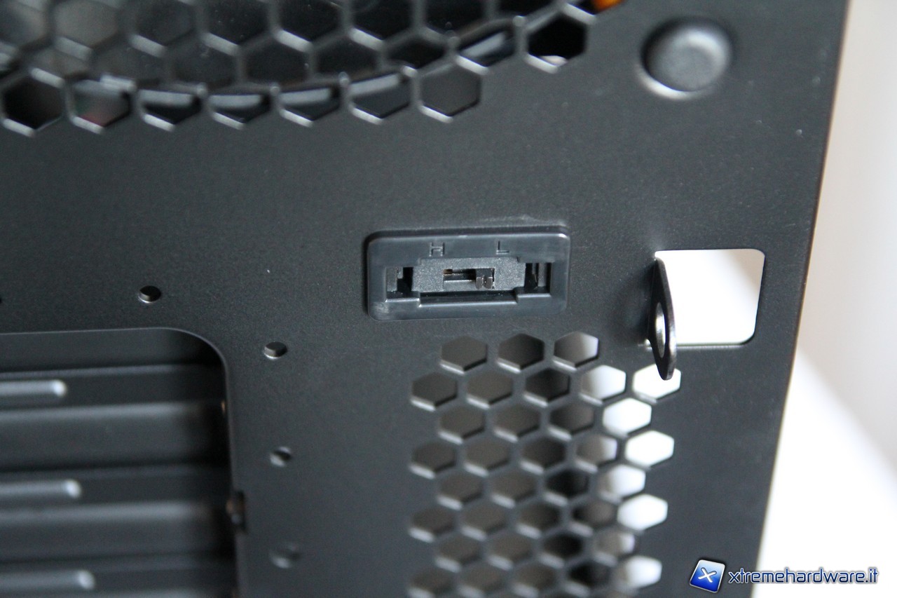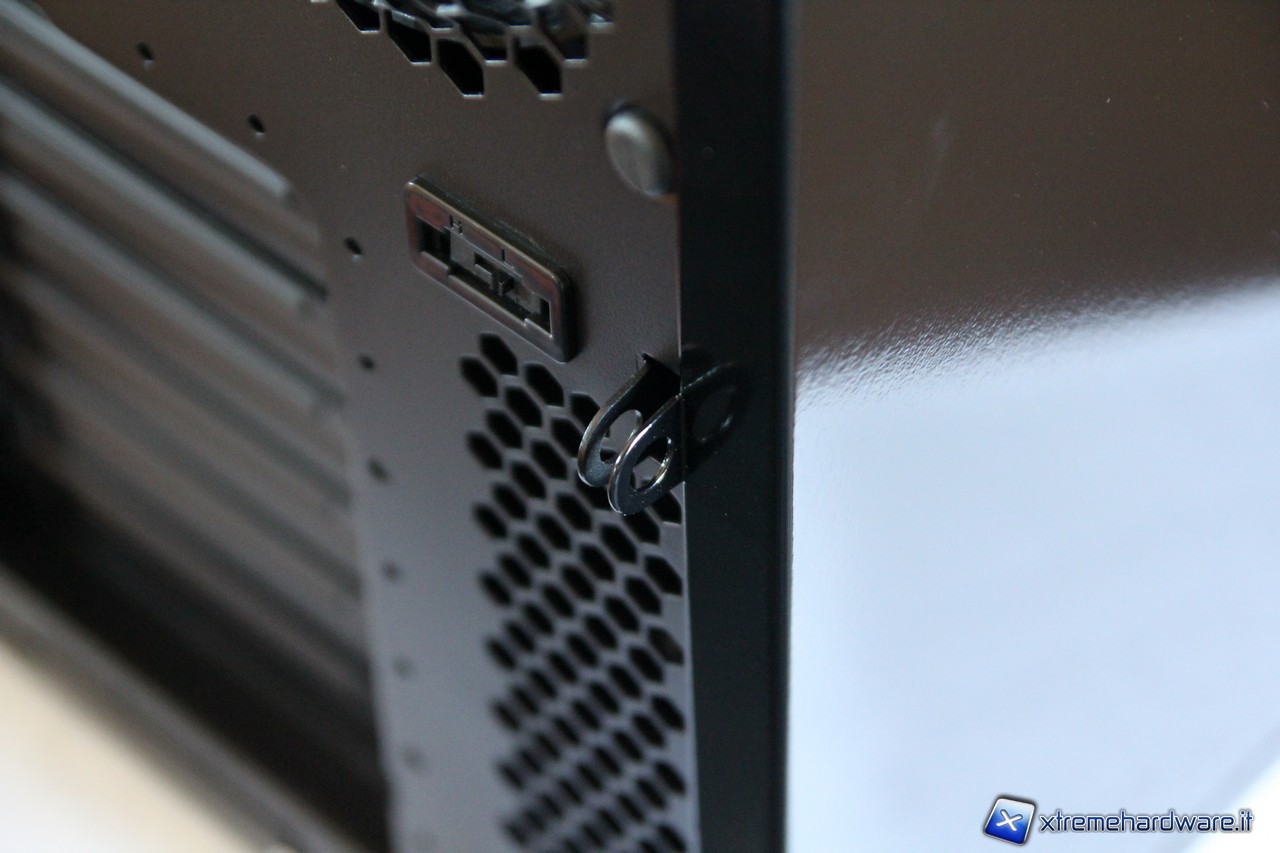I pannelli laterali non presentano finestre o griglie di aereazione, la loro verniciatura è perfetta e priva di imperfezioni. Particolare attenzione va al pannello sinistro che utilizza delle viti a pressione che rimangono attaccate al pannello stesso una volta rimosso. Esso incorpora inoltre un sistema di sicurezza composto da due anelli nel quale potremmo apporre un lucchetto per impedire l’accesso al nostro hardware interno.